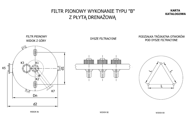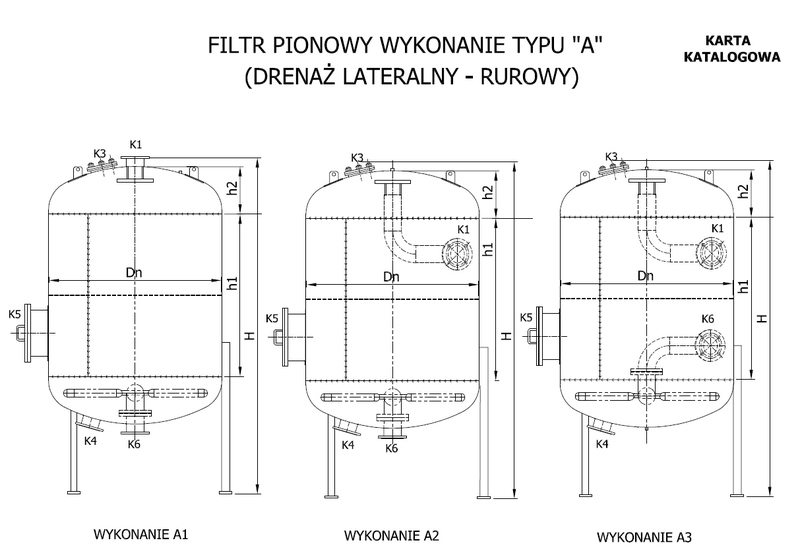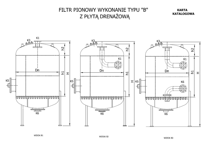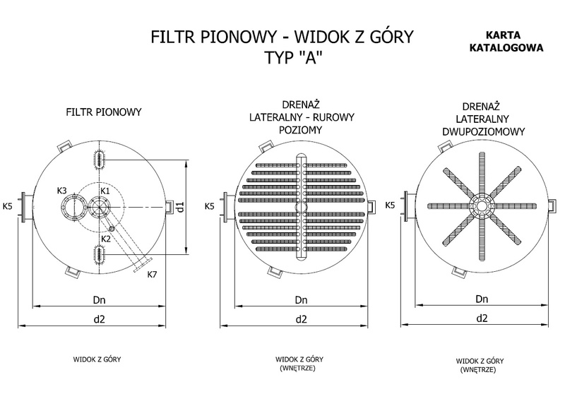 Filtr to zbiornik pionowy wykonany ze stali węglowej, posadowiony na trzech (czterech zależnie od typu) podporach stałych, przyspawanych do części walcowej zbiornika. Część walcowa (płaszcz) zamknięta jest z dwóch stron dnami wypukłymi. Zbiornik wyposażony jest w zespół króćców przyłączeniowych oraz właz rewizyjny umożliwiający przeprowadzenie rewizji wewnętrznej oraz prac remontowych. W dennicy górnej znajduje się właz zasypowy wykorzystywany podczas wypełniania zbiornika złożem filtracyjnym.